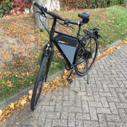 Basis is een klassiek stalen diamantframe (ook in extra large, verlaagde instap of renfiets verkrijgbaar) waarbij bijna de gehele driehoek van zitbuis, boven- en onderbuis gevuld is met een metalen bak. Hierin zit niet alleen de elektronica maar ook de accu die daardoor tot zelfs 2.400Wh groot kan zijn, waardoor geschermd kan worden met reikwijdten tot 300 km! Als dat geen unique selling point is. De accubak is in verschillende kleuren te verkrijgen (of je plakt er je eigen logo op). Het framedriehoekje onder het zadel is handig voor het vastleggen van de fiets of om hem op te tillen.