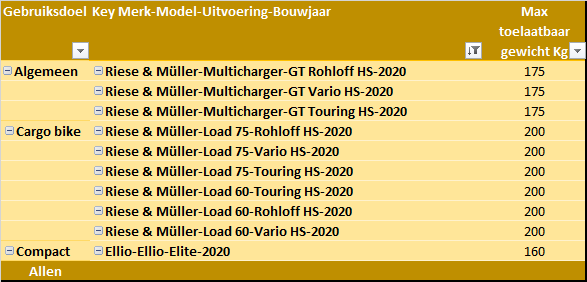 Boven: tabel eigen gewicht in Kg per speedpedelec per gebruiksdoel in 2020.